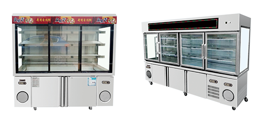 产品两侧为双层真空玻璃,三层层盘,顶部带灯箱以及灯光,非营业时间,可以把节能帘拉下来,既节能又保持干净卫生,上半部分为高温烤漆板,下半部分为201不锈钢板。